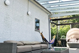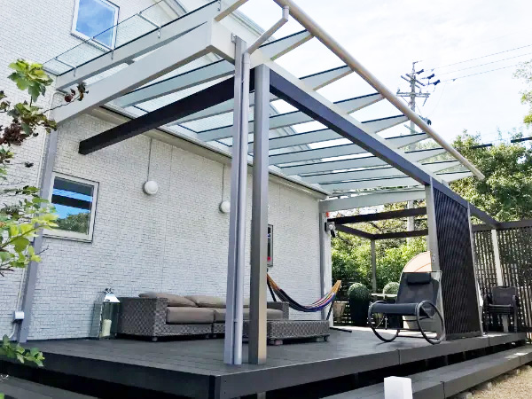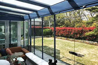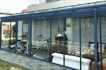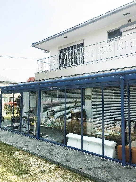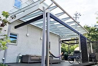 SL22最大の特徴は側面ガラスパネルが特殊形状に対応しており、傾斜している屋根の勾配に合わせてガラスパネルをオーダーできる点です。そして、特殊形状でもガラスパネルをスライドできるのが、他社製品にはない最大の特徴です。