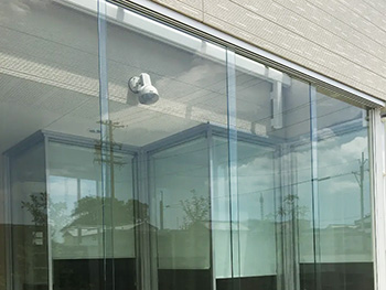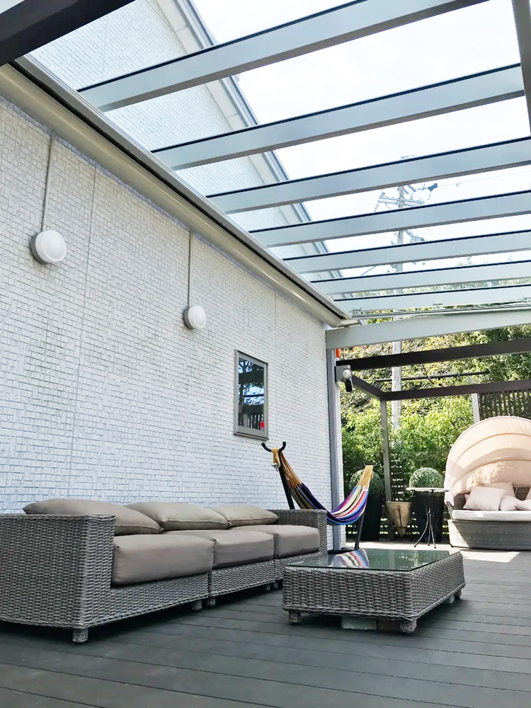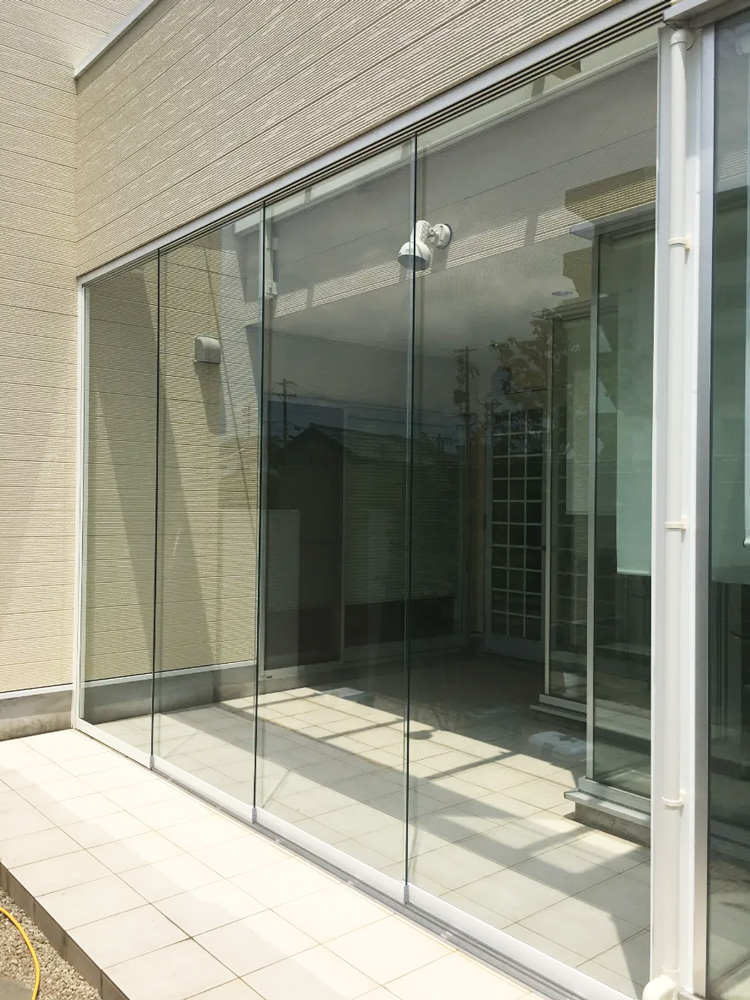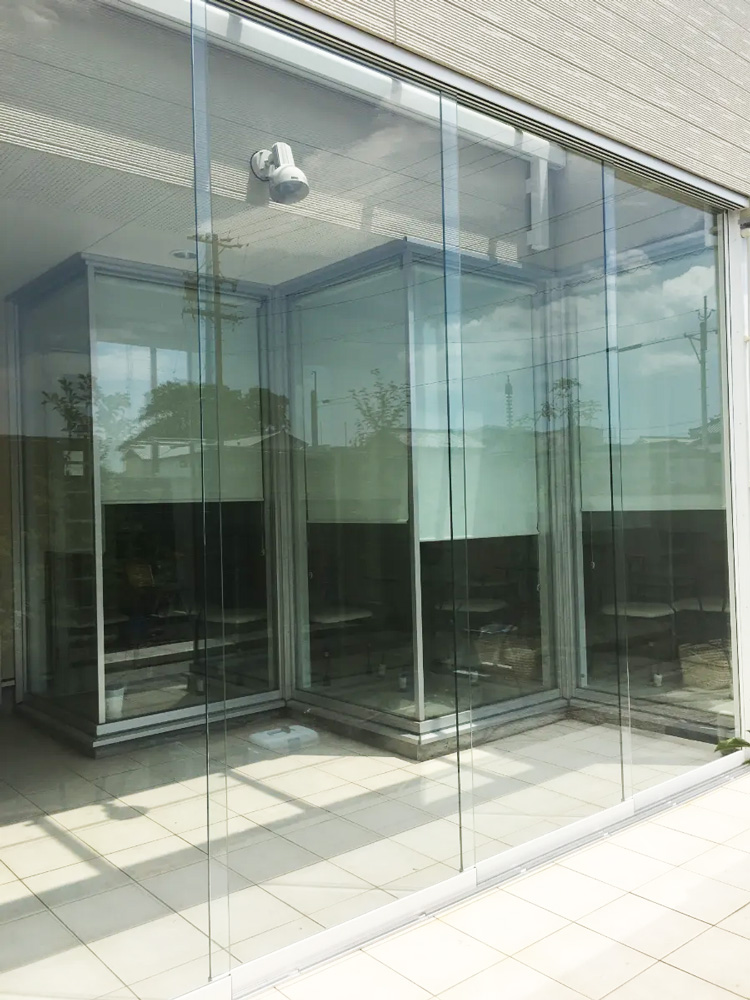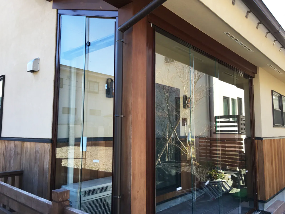 建物の軒下にガラスパネルをはめ込んでいる点が最大の特徴で、建物のデザインを損なうことなく、ガラスに囲まれた室内空間を実現できました。