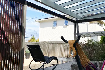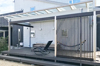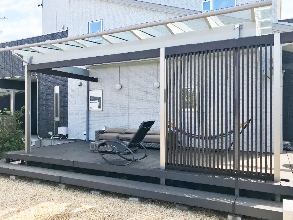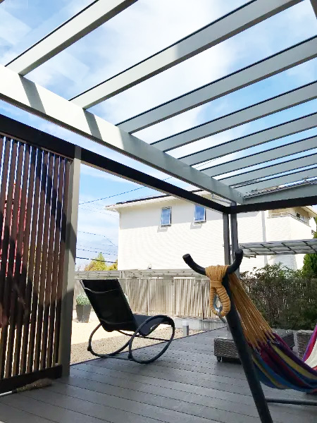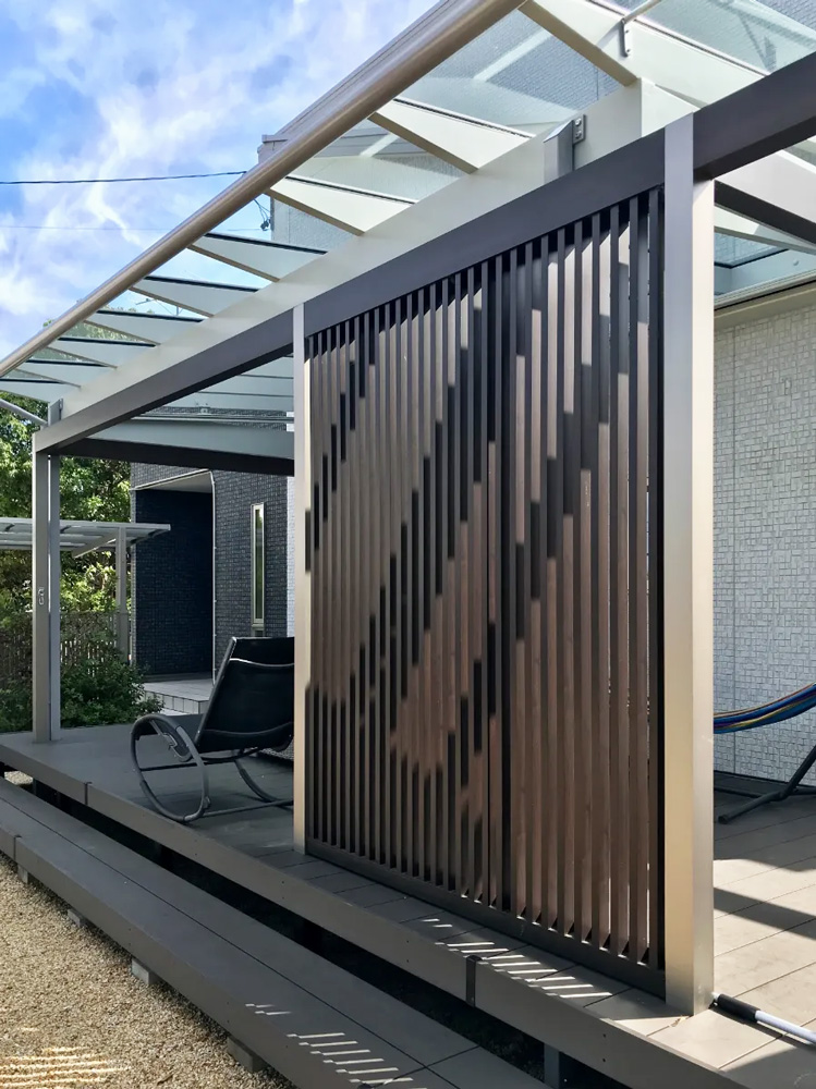 お庭に面した「オーラ」は日常の中にゆっくりと寛げる空間と時間を生み出してくれ、日々の生活をより豊かにしてくれます。木目のウッドデッキやプラスGの目隠しが「オーラ」にとてもマッチしています。